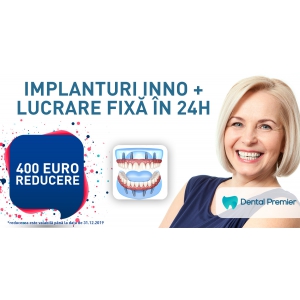 În perioada 1 noi – 31 dec 2019, se oferă o reducere de 400 Euro la restaurările dentare totale cu implanturi INNO şi lucrare fixă în 24 ore prin INNOvator Fast Smile® – marcă înregistrată Dental Premier!
