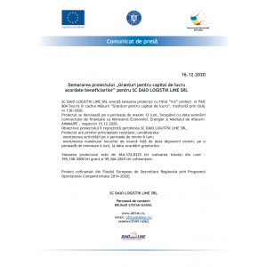 Demararea proiectului „Granturi pentru capital de lucru acordate beneficiarilor” pentru SC DAIO LOGISTIK LINE SRL