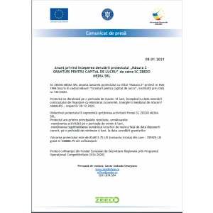 SC ZEEDO MEDIA SRL anunta lansarea proiectului cu titlul ”Masura 2” proiect nr RUE 1906 înscris în cadrul Măsurii ”Granturi pentru capital de lucru”, instituită prin OUG nr 130/2020.