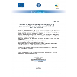 Obiectivul proiectului îl reprezintă sprijinirea societatii WINES AND MORE EXPERIENCE SRL