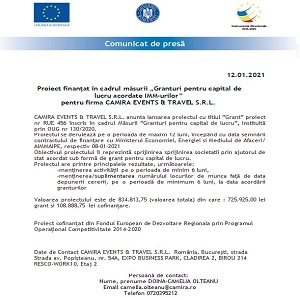 Proiect finanțat în cadrul măsurii „Granturi pentru capital de lucru acordate IMM-urilor”pentru firma CAMIRA EVENTS & TRAVEL S.R.L.