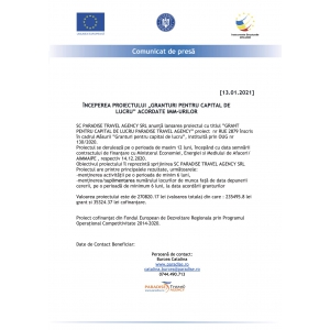 SC PARADISE TRAVEL AGENCY SRL anunță lansarea proiectul cu titlul ”GRANT PENTRU CAPITAL DE LUCRU PARADISE TRAVEL AGENCY” proiect  nr RUE 2879 înscris în cadrul Măsurii ”Granturi pentru capital de lucru”, instituită prin OUG nr 130/2020.